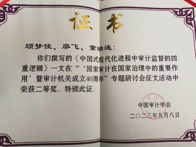 近日,審計署網站公布了由中國審計學會主辦的“‘國家審計在國家治理中的重要作用’暨審計機關成立40周年”專題研讨會征文活動獲獎名單,我院青年教師顧夢佳撰寫的《中國式現代化進程中審計監督的四重邏輯》一文榮獲二等獎。