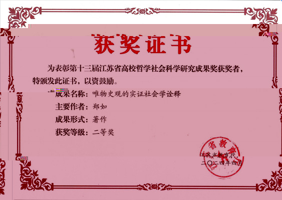 近日,江蘇省教育廳正式公布第十三屆江蘇省高校哲學社會科學研究成果獎,我院鄭如副教授的專著《唯物史觀的實證社會學诠釋》喜獲二等獎。