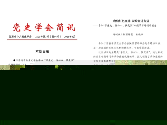 8月8日至12日,江蘇省中共黨史學會“學黨史、悟初心、強黨性”專題培訓班在陝西省中共富平縣委黨校舉辦。我院教師束曉冬博士受邀參加此次培訓,并在學會簡訊上發表題為《赓續紅色血脈 凝聚奮進力量》學習心得,分享了對黨史學習的深刻體會與思考。