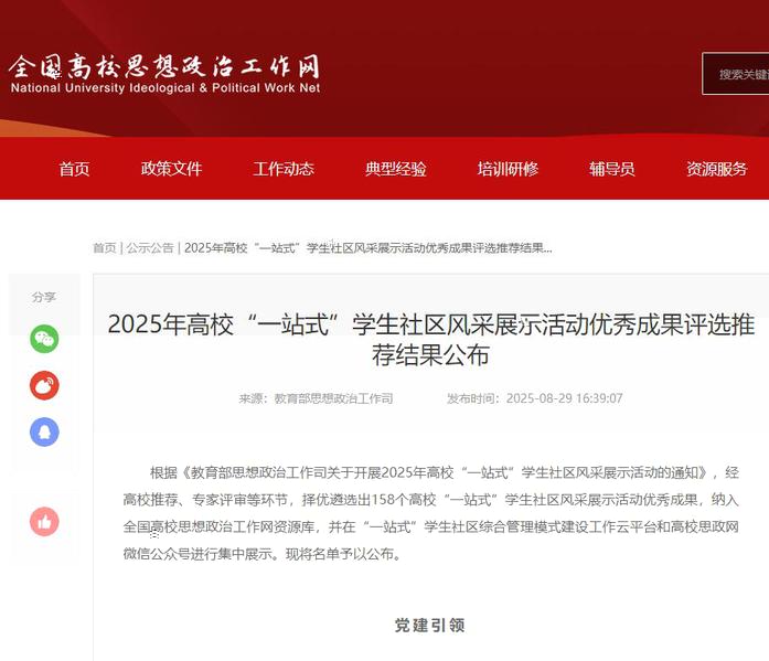 此次評選根據《教育部思想政治工作司關于開展2025年高校“一站式”學生社區風采展示活動的通知》,經高校推薦、專家評審等環節,擇優遴選出158個高校“一站式”學生社區風采展示活動優秀成果,納入全國高校思想政治工作網資源庫,并在“一站式”學生社區綜合管理模式建設工作雲平台和高校思政網微信公衆号進行集中展示。